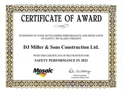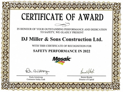 D.J. Miller & Sons Construction is committed to ensuring the highest standard of safety & safe work environment for our employees and clients we work for. We received our Certificate of Recognition (COR) in 2001 through the Heavy Construction Safety Association. We have continued to maintain one of the highest comprehensive safety programs within the industry and have received the Group 4 award for a number of years. We are also registered with the ISNetworld.